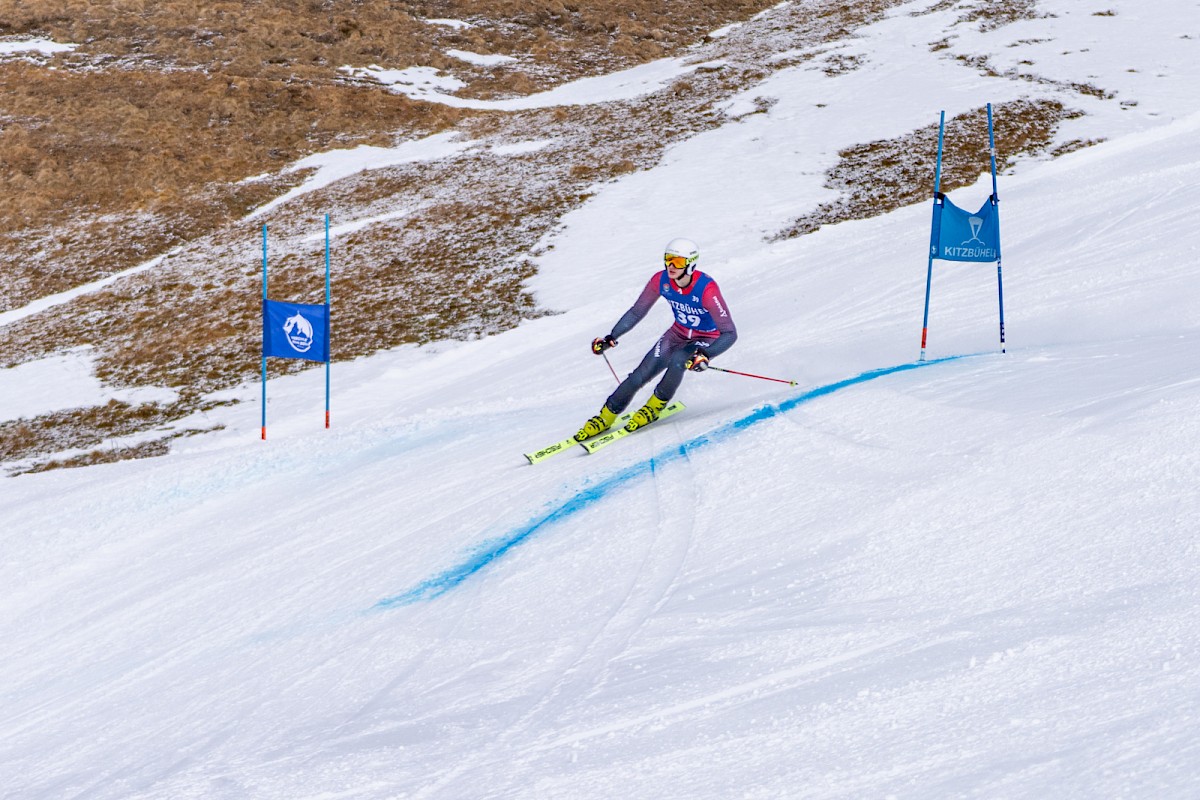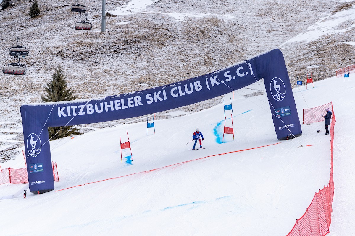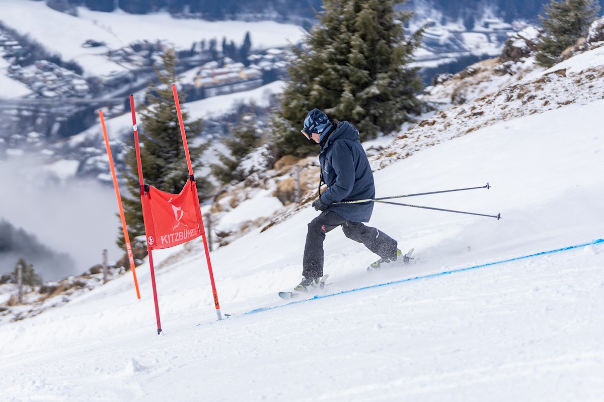 Renntag 1 bei den Virtus Open Alpine Ski in Kitzbühel und frühmorgens zeigte sich das Wetter auf dem Horn nicht von seiner schönsten Seite:  Regen im Tal, dichter Nebel am Berg. Der Start des Super-G wurde daher wohlweislich etwas nach unten verlegt. Und siehe da: Je näher die Startzeit um 10.50 Uhr rückte, desto idealer wurden die Bedingungen, vor allem die Sicht. Zudem hatten alle 45 Teilnehmer bis dahin bereits einen Trainingslauf absolviert und waren mit dem von Martin Nessler gesetzten Kurs bestens vertraut.